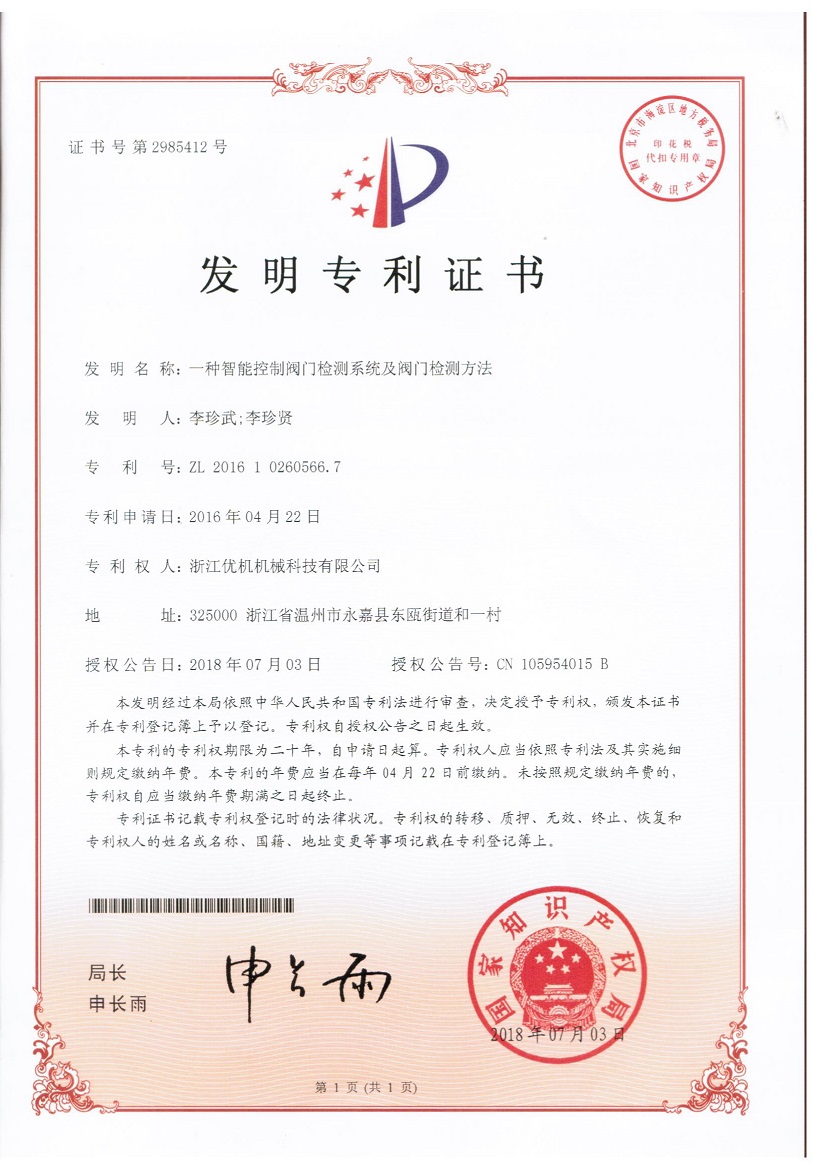 今年4月浙江優(yōu)機(jī)機(jī)械科技有限公司《一種閥門檢測設(shè)備》發(fā)明專利,獲得國家知識產(chǎn)權(quán)局授權(quán)。捷報(bào)連連該公司16年申請的一種智能控制閥門檢測系統(tǒng)及檢測方法已在2018年7月03日授權(quán)公告,公告號:CN105954015B發(fā)明專利號:ZL 2016 1 0260566.7